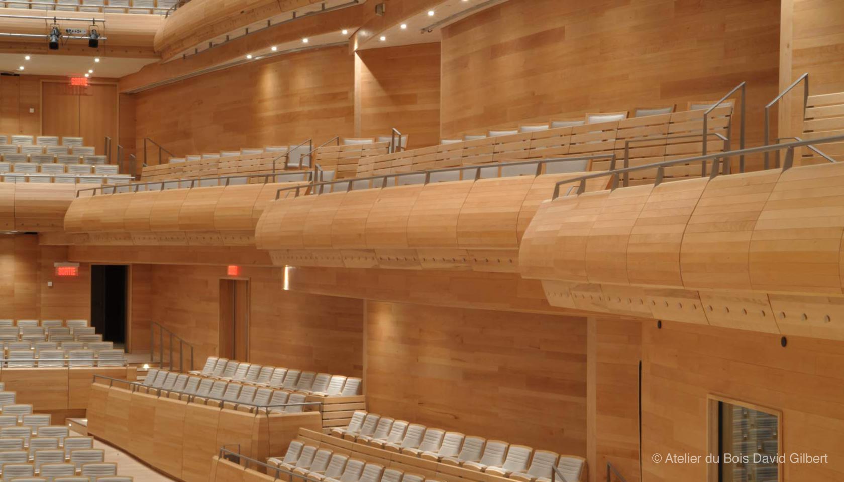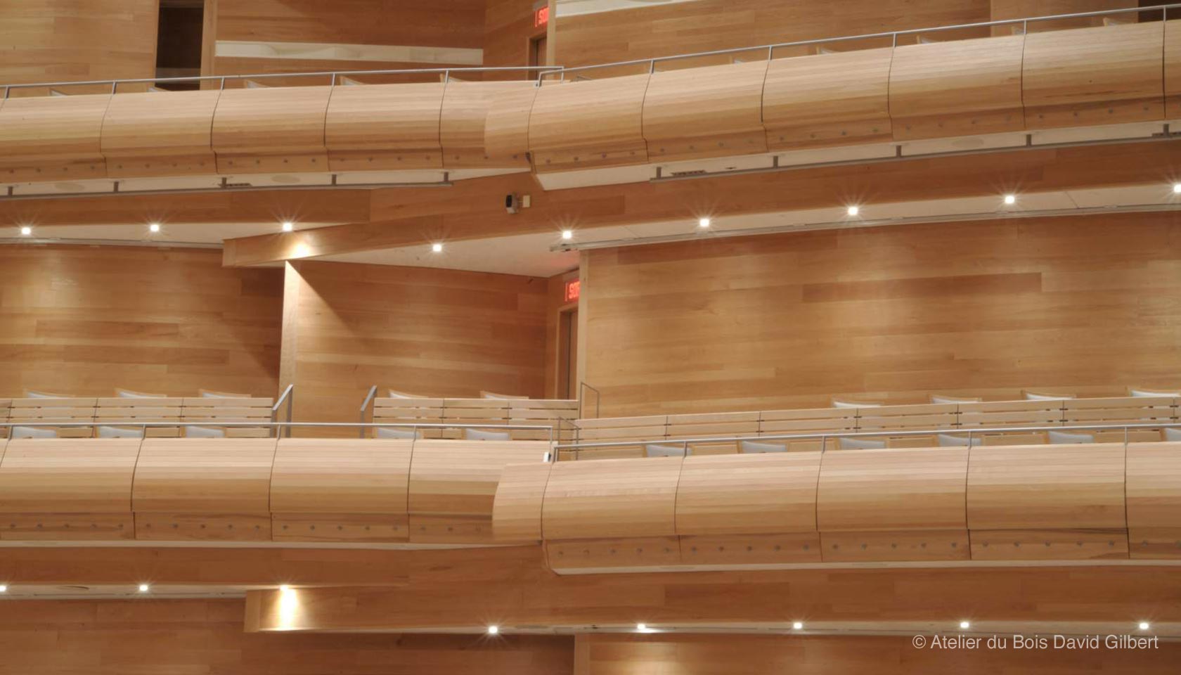 David Gilbert est très fier d’avoir été sélectionné parmi les plus grandes entreprises du Canada pour réaliser les revêtements de bois du plus prestigieux projet architectural de bois d’apparence du Canada des 20 dernières années. Le mandat était de fournir tout le bois et de couvrir entre autres, les murs, les colonnes, le mur de l’orgue, la scène, les planchers, les moulures de toutes sortes et les escaliers.